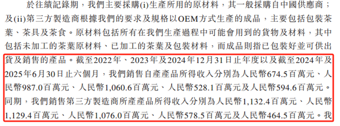 而在产品上,为了支撑“全品类”战略,八马茶业相当一部分产品并非自产。招股书显示,2022年和2023年,八马茶业“代工”产品收入,均超过了其自产产品收入。直到2024年,代工收入占比才降至50%以下。