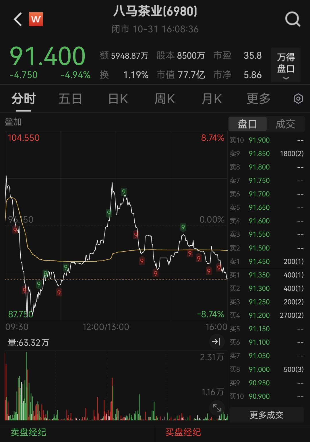 此后到10月30日,八马茶业延续上涨态势,截至收盘报96.15港元/股,涨幅为3%。10月31日,略有回落,截至收盘报91.40港元/股。