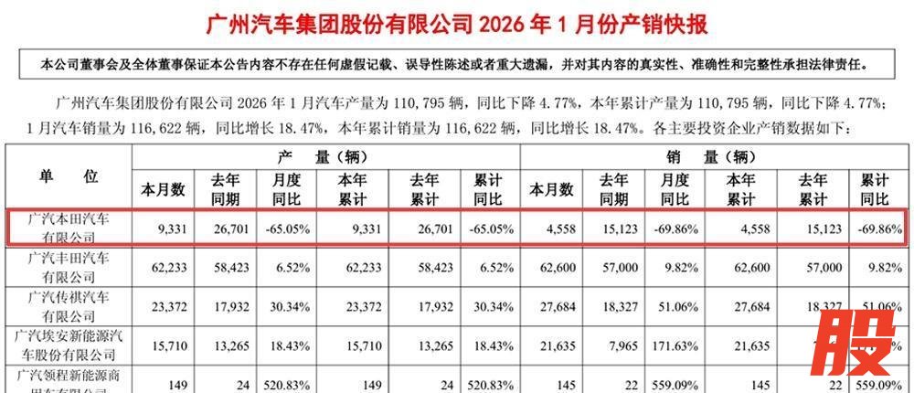 广汽集团1月份唯一出现销量同比下滑的品牌就是广汽本田,1月销量跌至4558台,同比下滑69.86%,相比去年12月超过5万台的单月销量,环比下滑更是高达91%。说实话,2026年开年首月广汽本田就出现比“拦腰斩”还可怕的同比环比双下滑,真的是出乎意料。